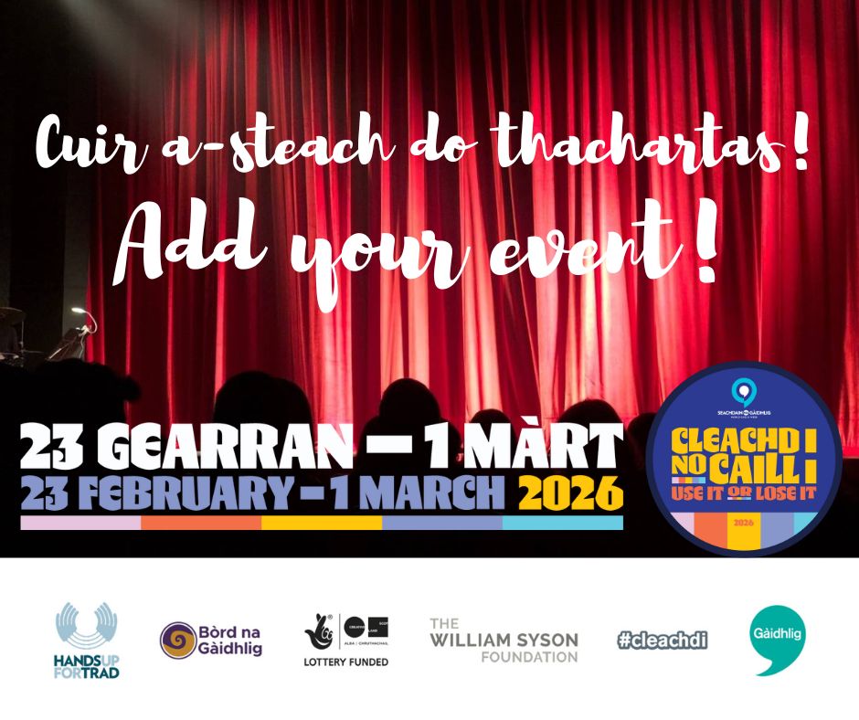 Feumaidh tu cunntas mus urrainn dhut tachartas rè Seachdain na Gàidhlig a chur ris agus a stiùireadh ann. Turas a bhios tu air clàradh, is urrainn dhut mion-fhiosrachadh an tachartais agad a dheasachadh uair sam bith agus a h-uile rud a chumail ùraichte! Nach bòidheach an rud?!
